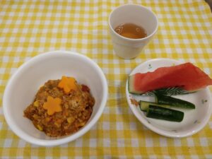 給食は、星型にした人参をのせた夏野菜たっぷりのドライカレーでした。