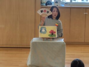 2歳児以上のクラスは、ホールでスケッチブックシアターによる節分の由来を見ました。