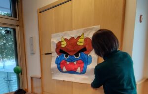 お部屋に戻って、鬼の絵に向かってカラーボールを投げて豆まきをしました。