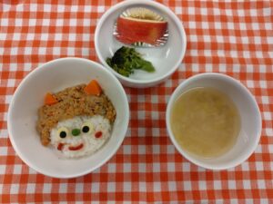 節分の給食は、鬼さんの炒め納豆でした。可愛い鬼さんの顔に、子どもたちも喜んで食べていました!